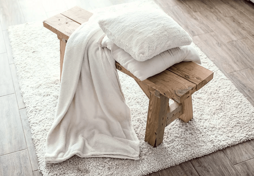 Small faux throws and rugs can add a touch of warmth and interest, as well as comfort on your bench seating. Not only does it look good, but it’s also just the softness your bottom needs when sitting on bench seating.