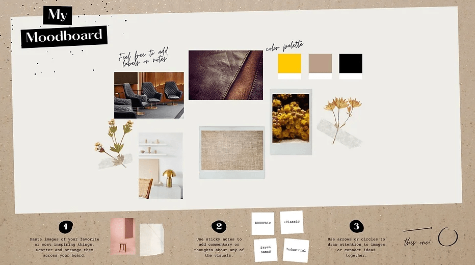These mood boards are more of a creative process and explore different styles and design elements before the project’s first draft or product is produced. This is useful for interior design.